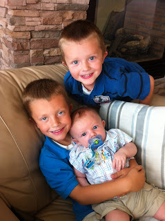 The boys are tanned from playing outside with friends and splashing at the park with their shirts off. They're dirty from catching rolly-polly bugs in the yard and climbing the rock piles at Nana and Papa's soon-to-be house. They're sweaty from playing tag at the park and riding their bikes up and down the street. Their faces are grubby from popcicles stains. Their clothes don't match because they slept in late and dressed themselves in yesterdays' clothes. They're so tired, by the end of the day, they look like this: