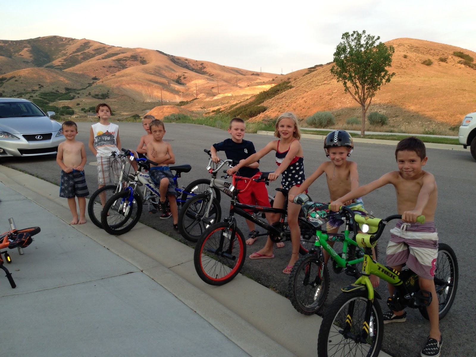 Since we had other plans on the 4th of July and weren't able to set off any fireworks, we decided to enjoy our own little firework display on the 24th of July/Pioneer Day instead. The boys had been saving their hard-earned allowance money for a few weeks to buy their own fireworks and were quite disappointed when we took them to the firework stand and they discovered that their combined $14 budget might be enough to buy a pack of sparklers and a couple pop-its. Dang, fireworks are such a rip-off! Being the awesome parents that we are, we took the boys to Costco where they used their money to "chip-in" on the Costco-special assorted fireworks package. Ordinarily, I would probably be a scrooge about buying fireworks because the entertainment is over within just a few minutes, but I actually felt like we got our moneys'-worth with these fireworks. The kids (our boys plus cousins and second-cousins) squealed and delighted in every single smoke bomb and ground flower. As it got dark, and we lit the fountain sparklers, the kids all lined up side-by-side and watched the mini-display with that pure excitement that only kids seem to possess. I feel like those are the magical moments of childhood that really matter, and, for that, I'm happy to get ripped off by the firework stands.